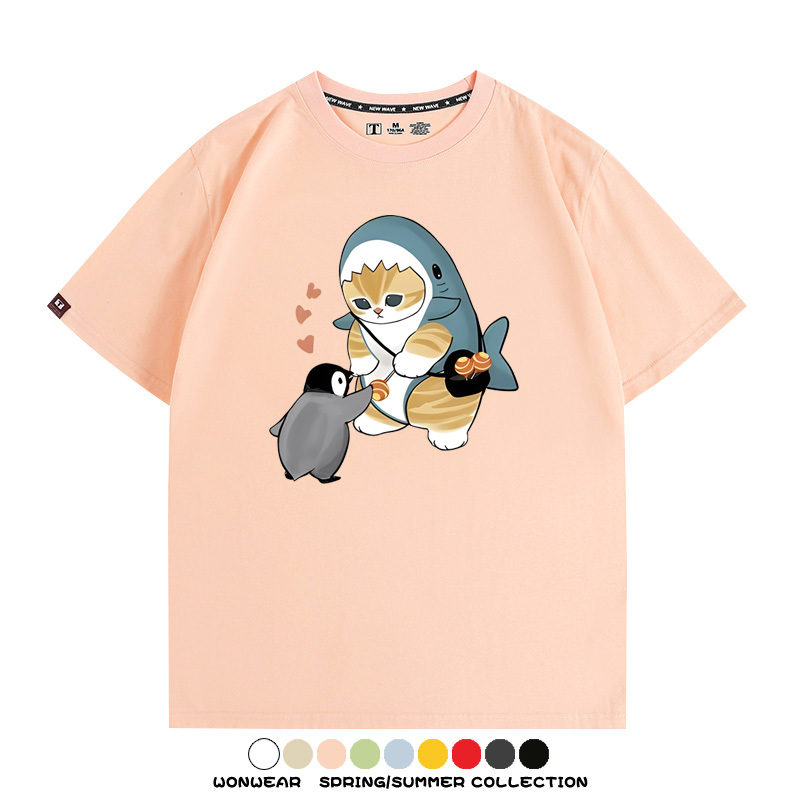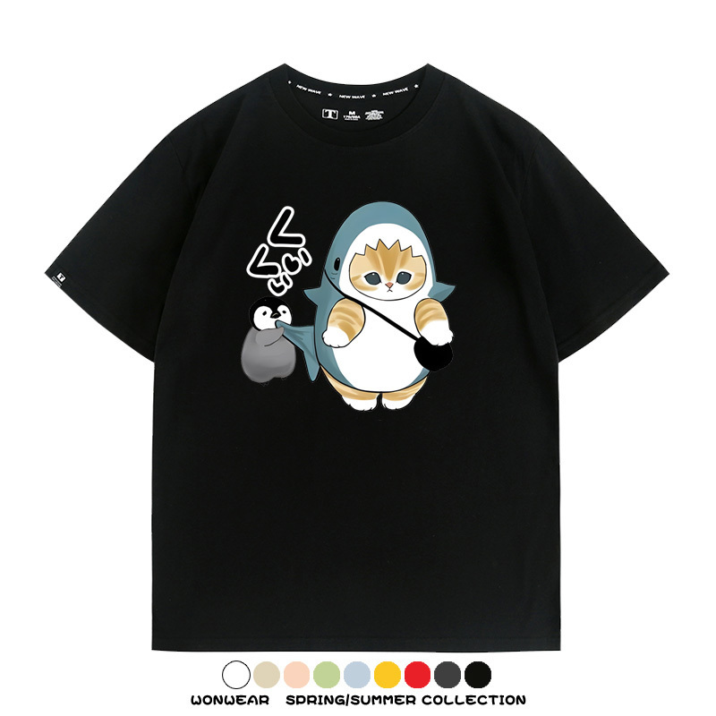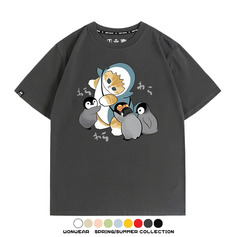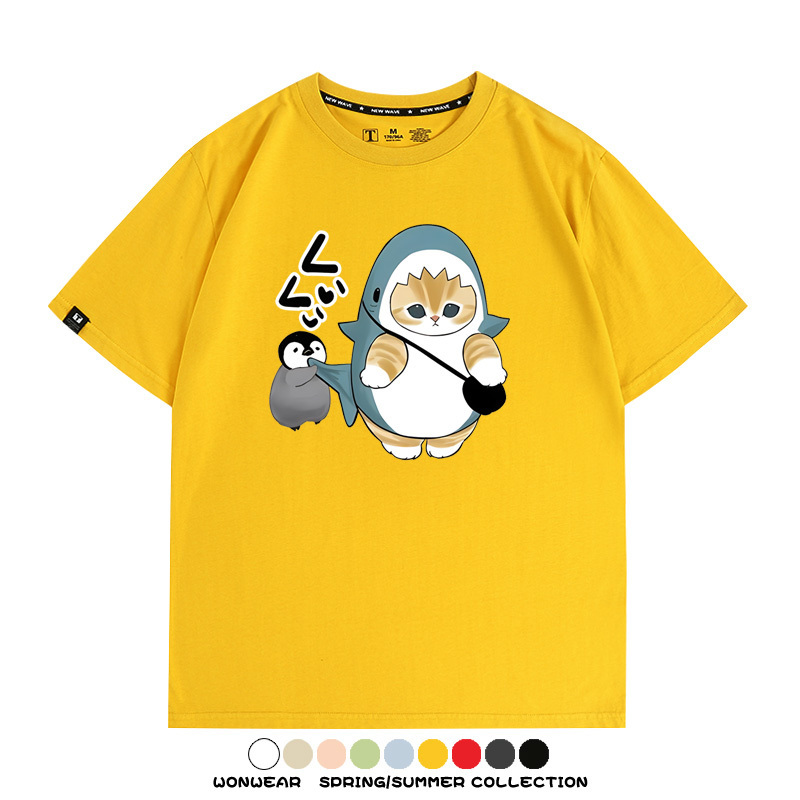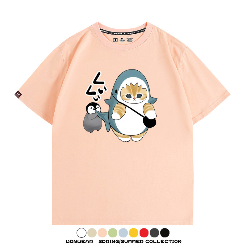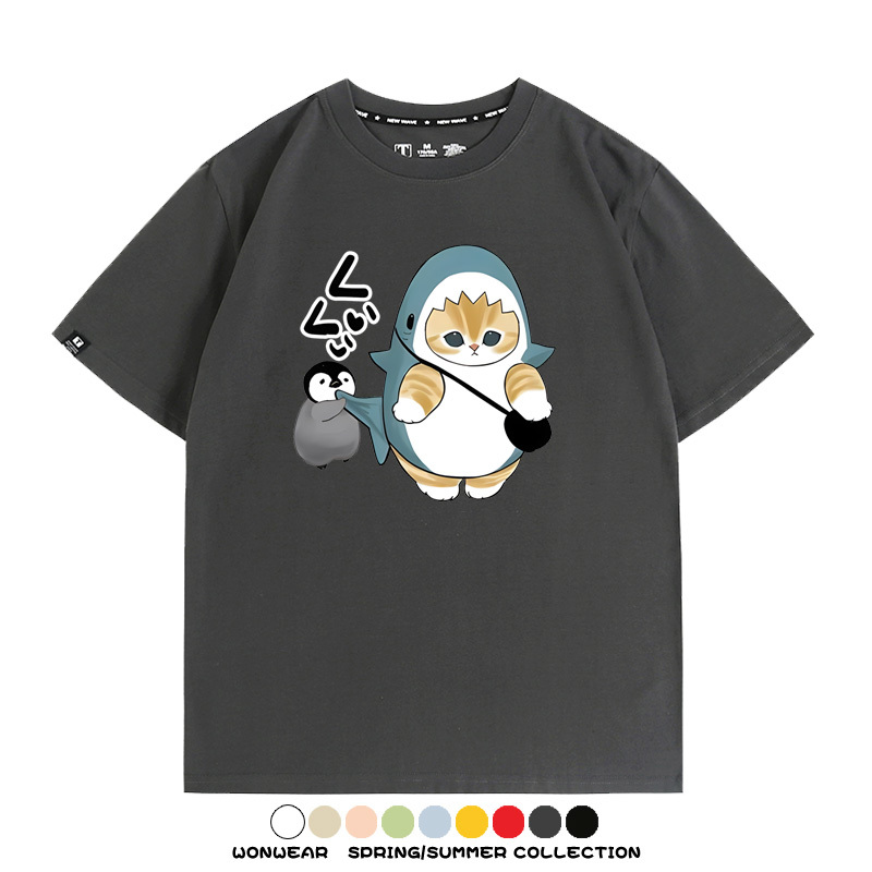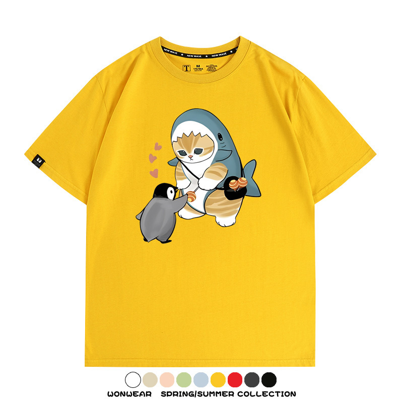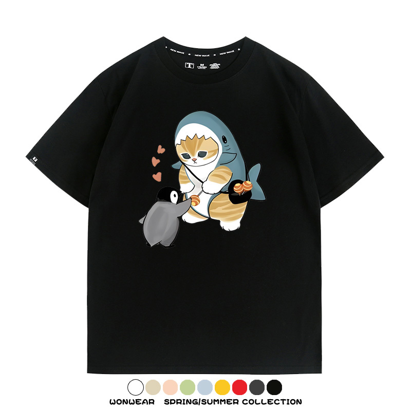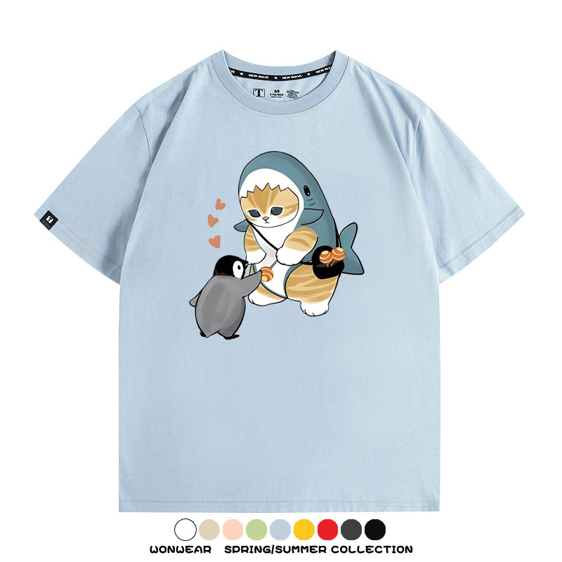 日系貓福珊迪鯊魚COS可愛企鵝鏟屎官情侶短袖純棉夏季寬鬆百搭T恤上衣