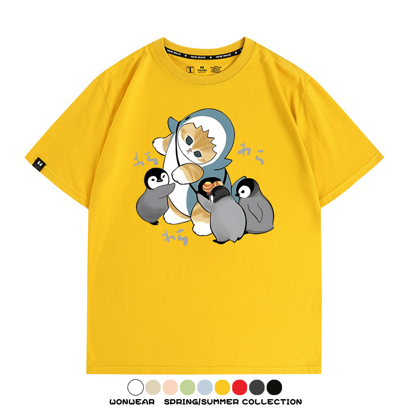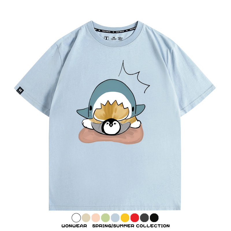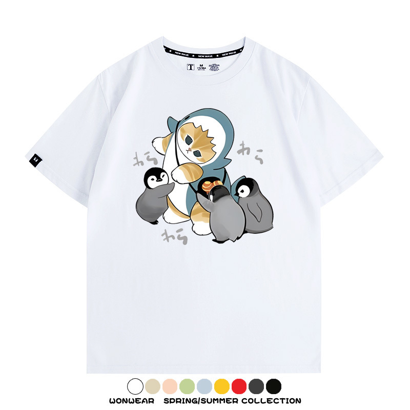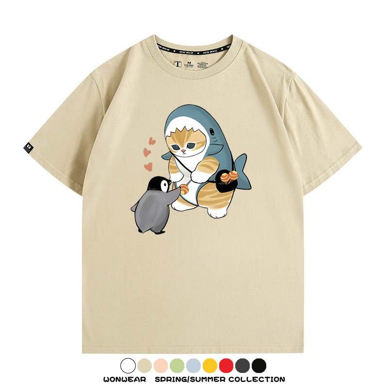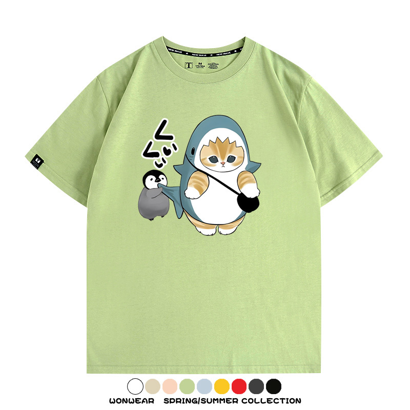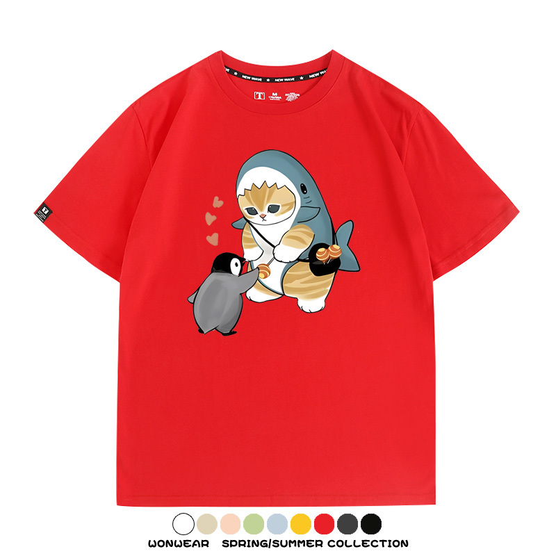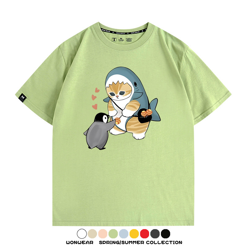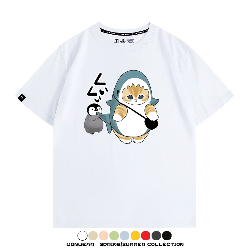 日系貓福珊迪鯊魚COS可愛企鵝鏟屎官情侶短袖純棉夏季寬鬆百搭T恤上衣