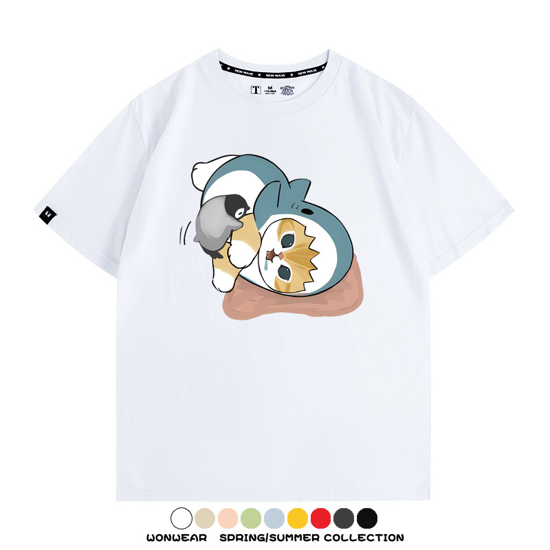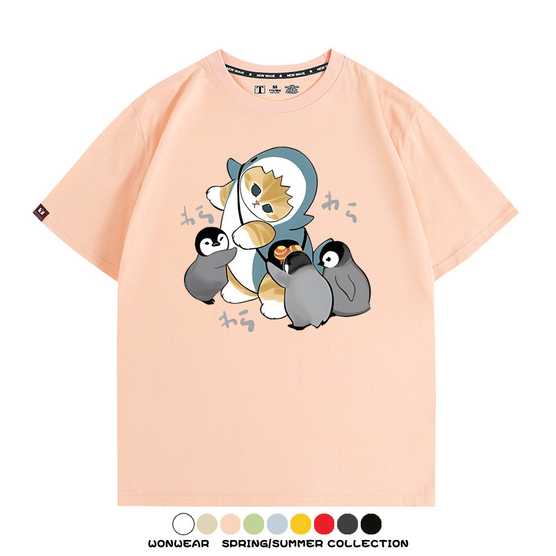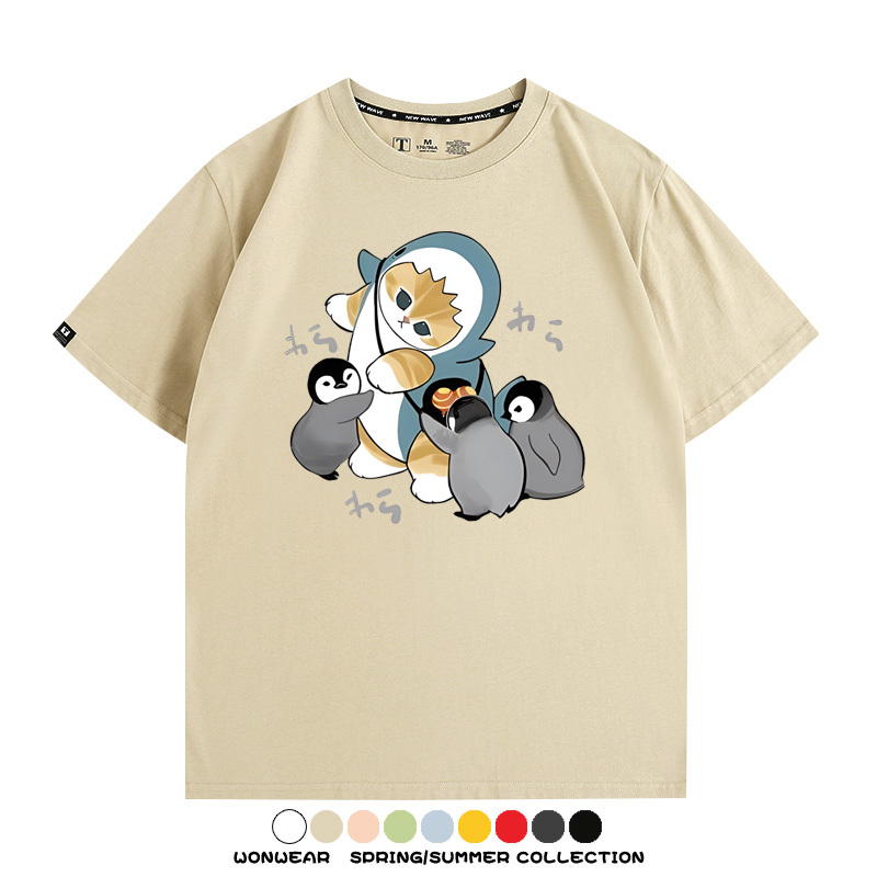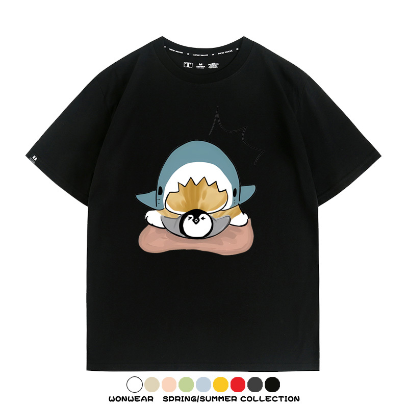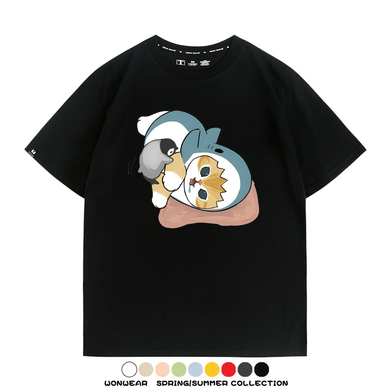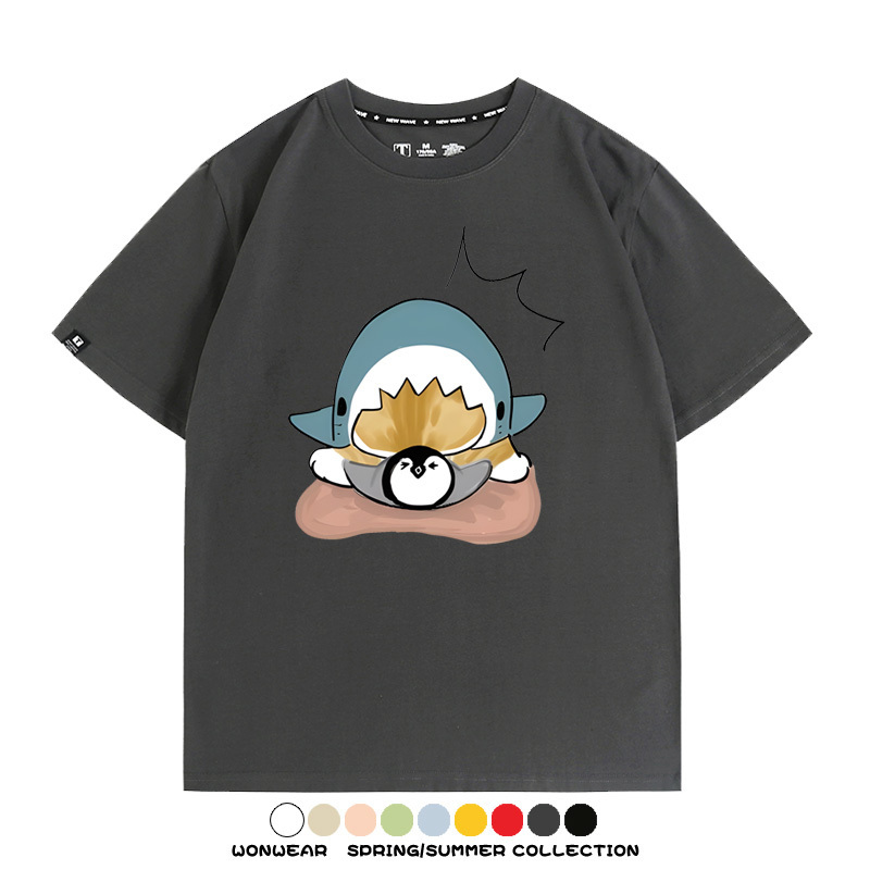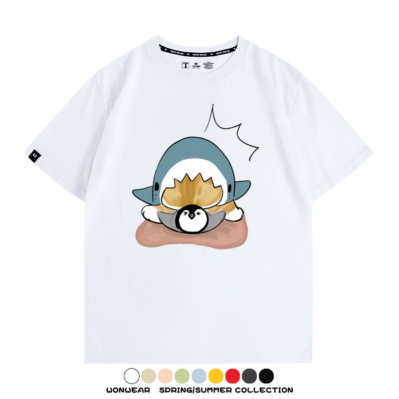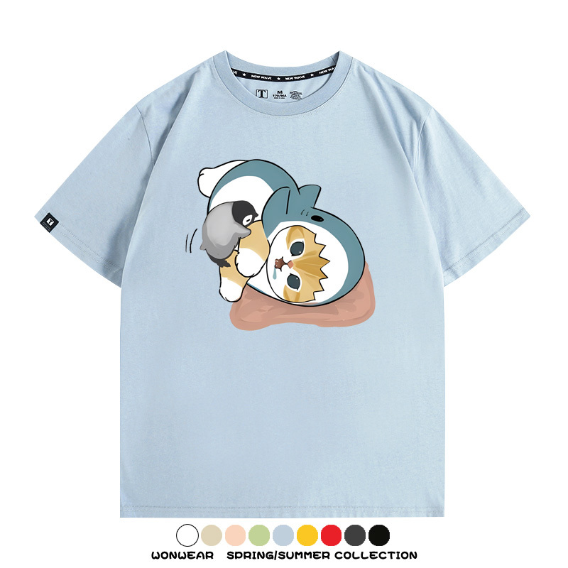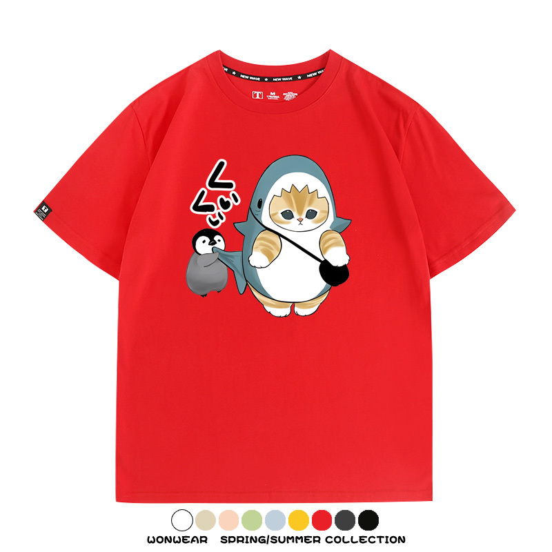 日系貓福珊迪鯊魚COS可愛企鵝鏟屎官情侶短袖純棉夏季寬鬆百搭T恤上衣