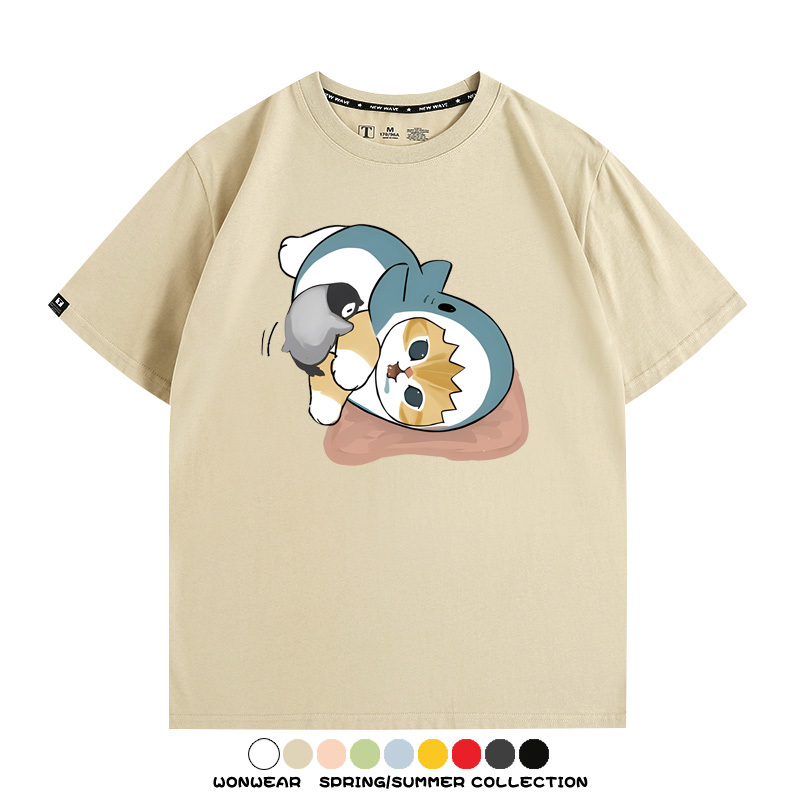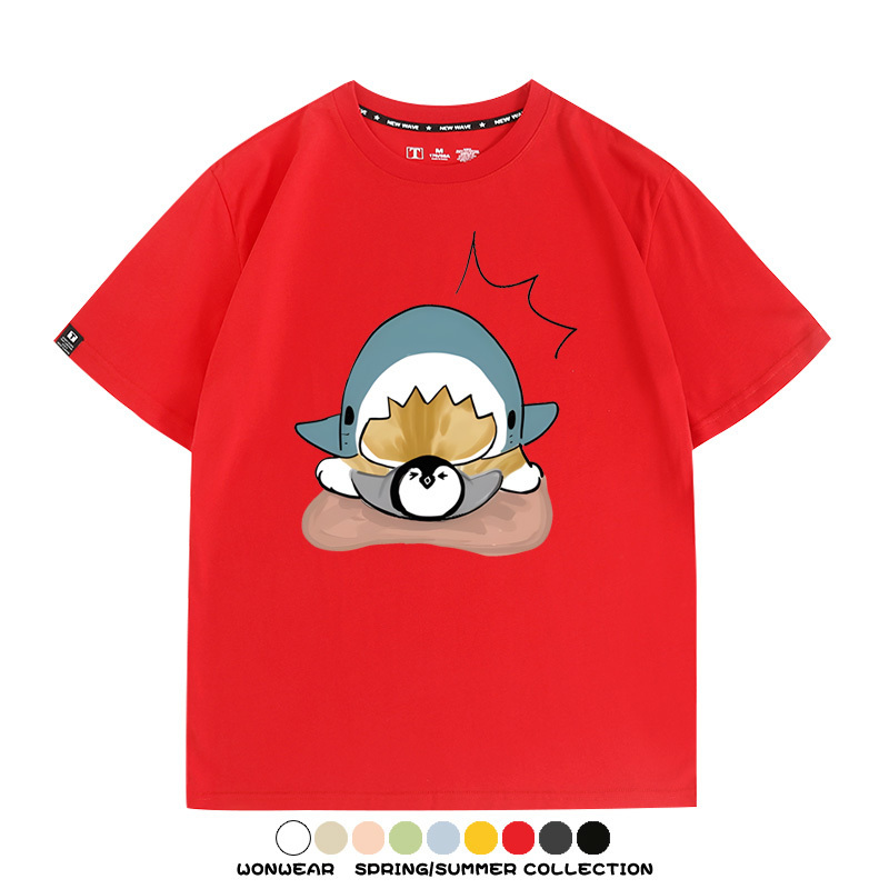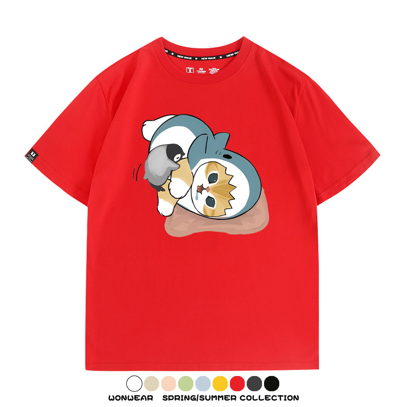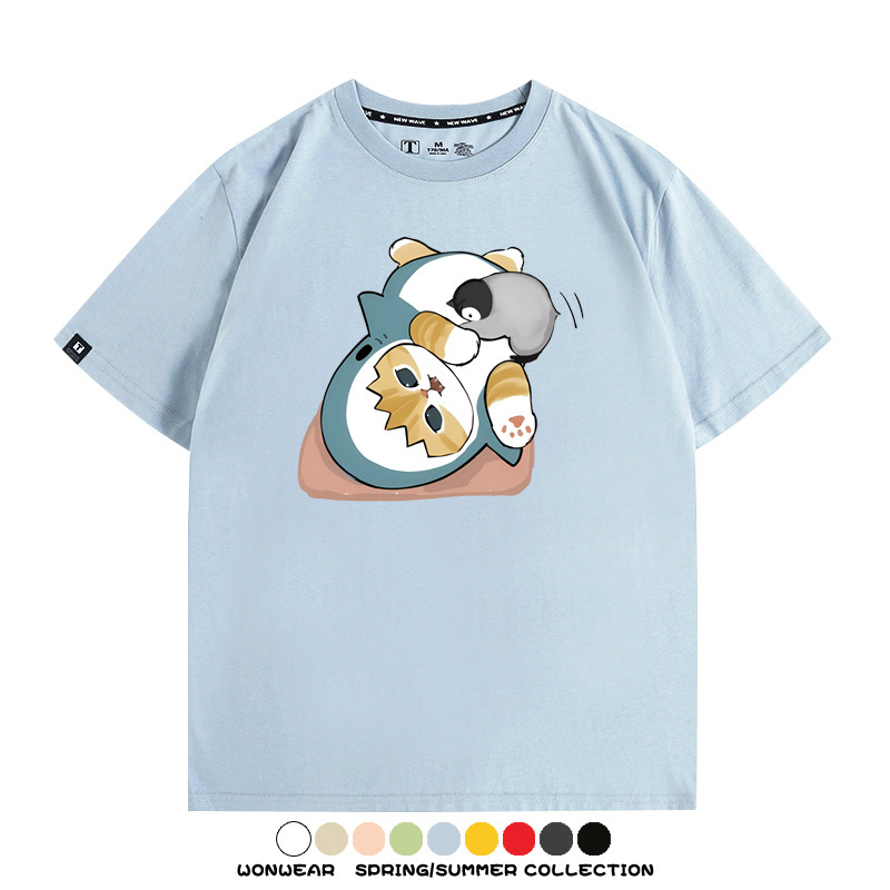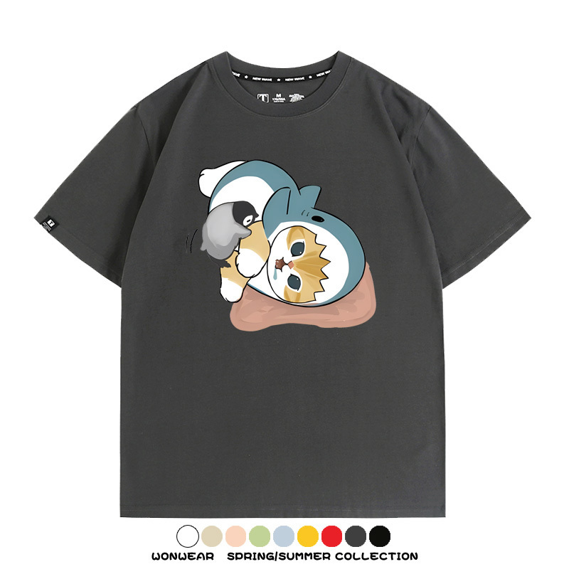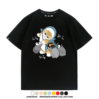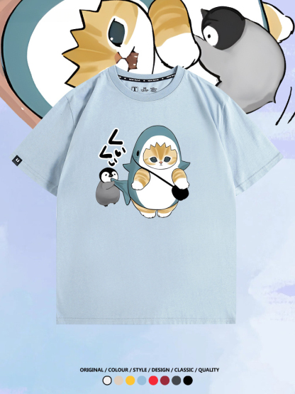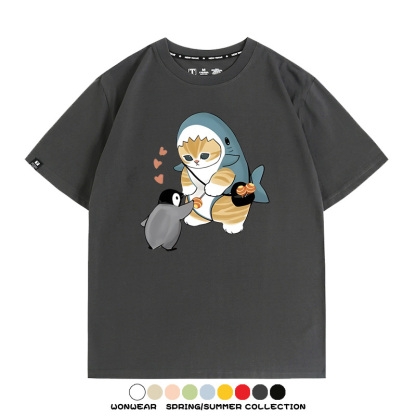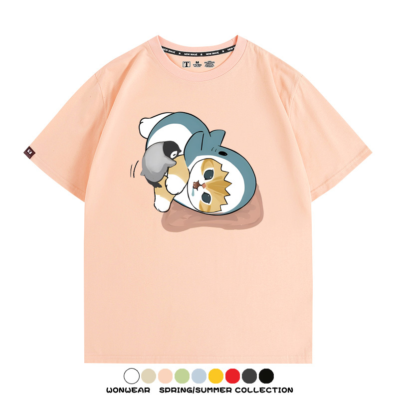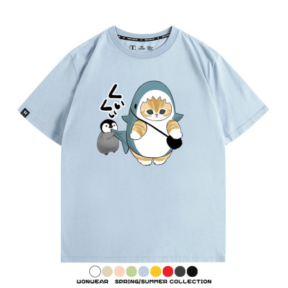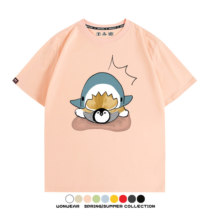 日系貓福珊迪鯊魚COS可愛企鵝鏟屎官情侶短袖純棉夏季寬鬆百搭T恤上衣