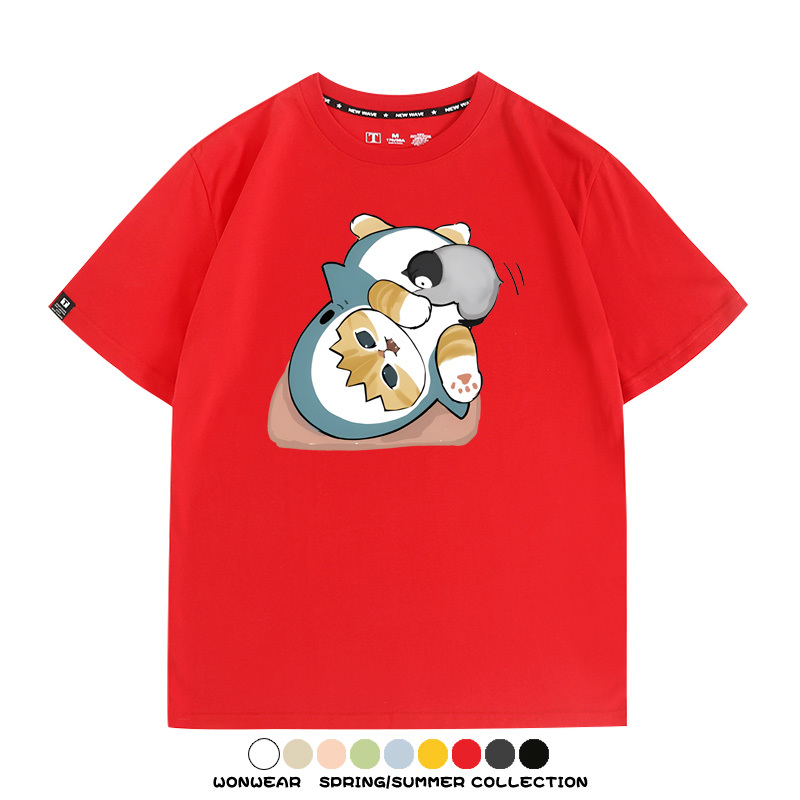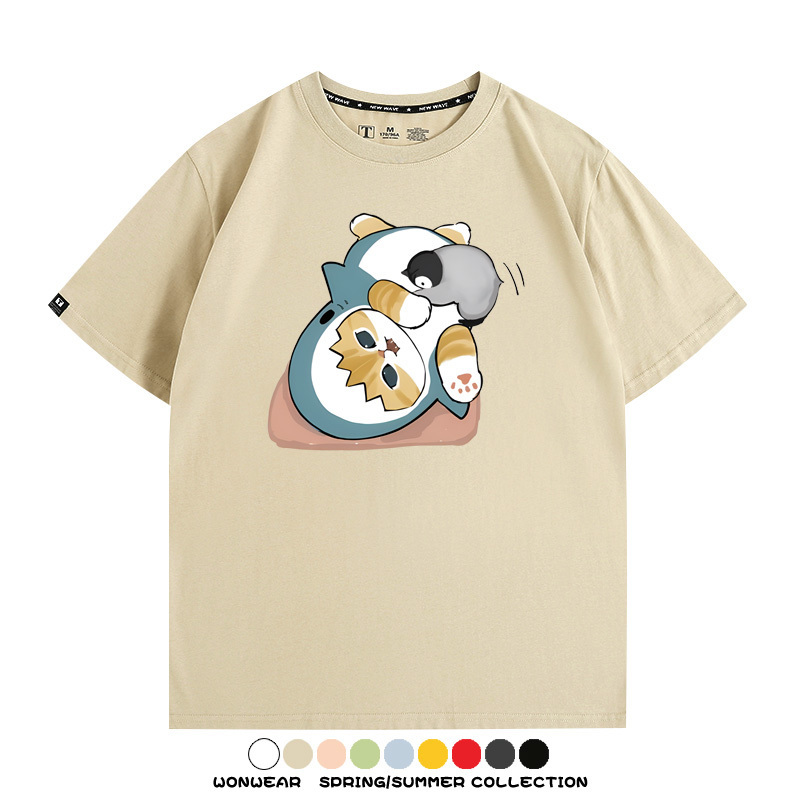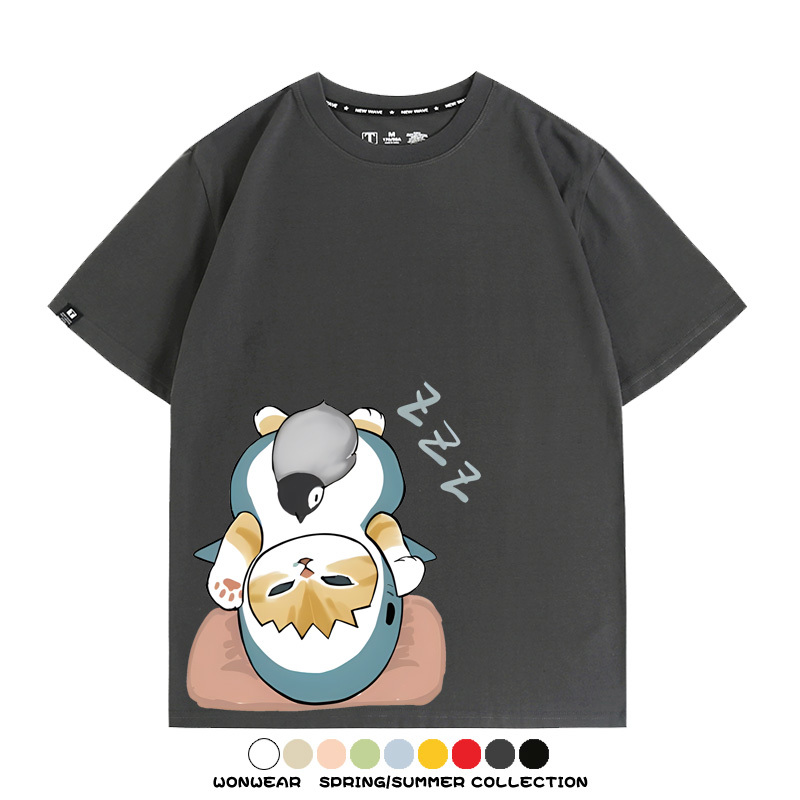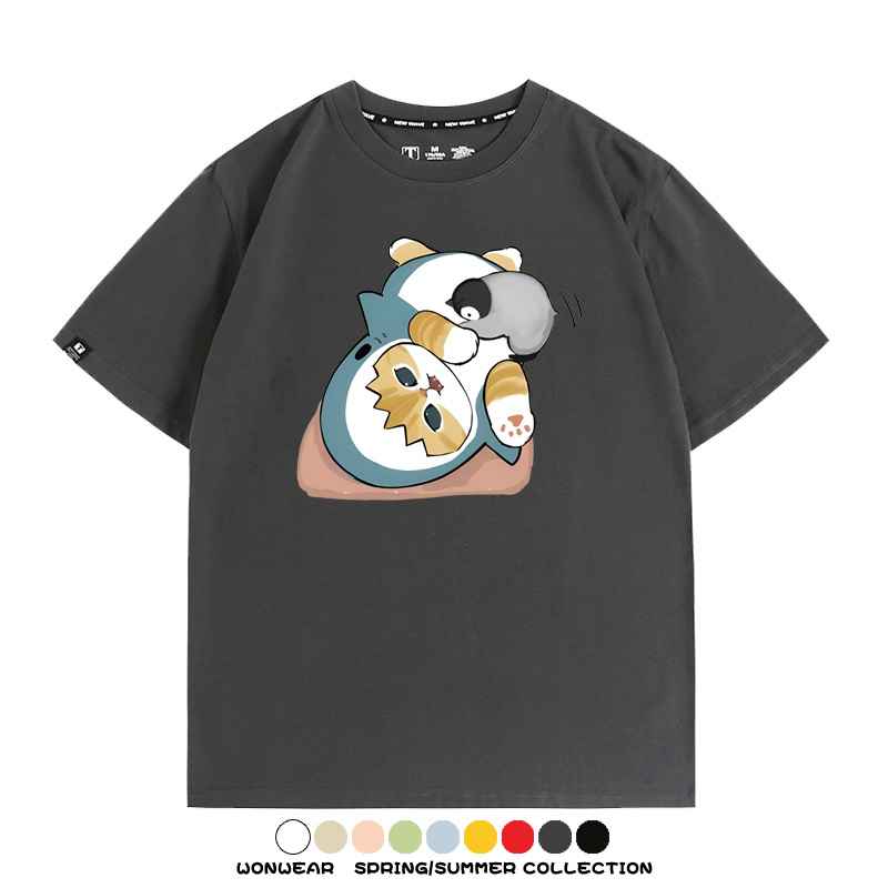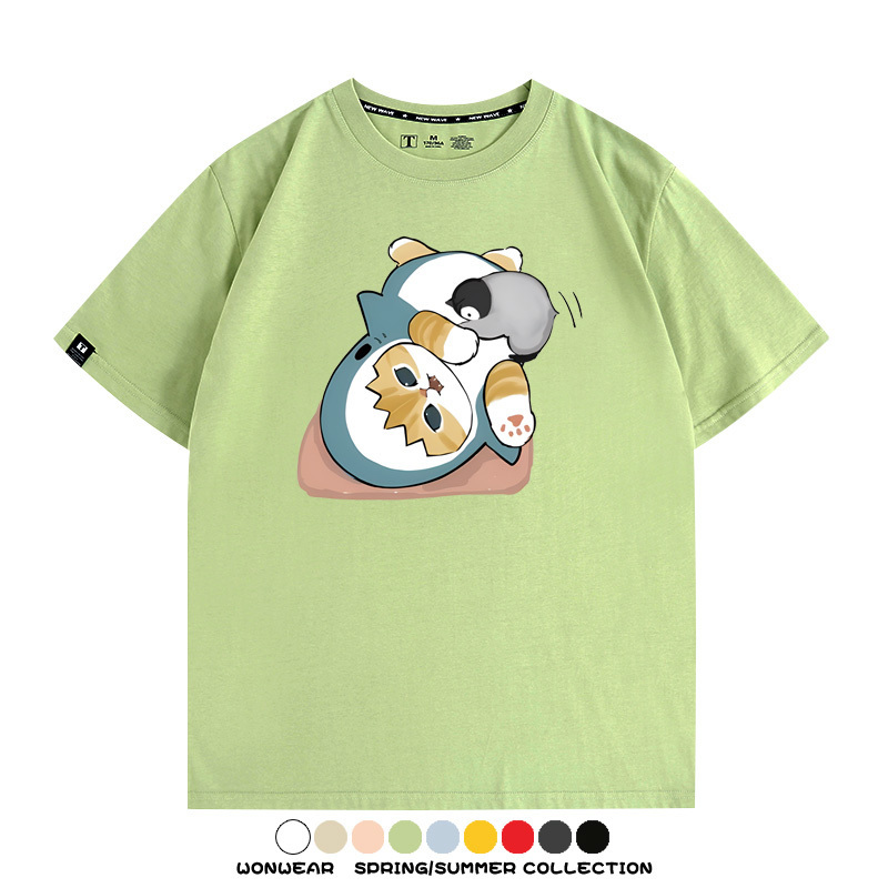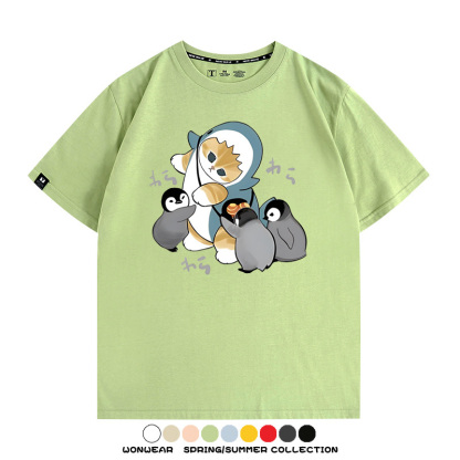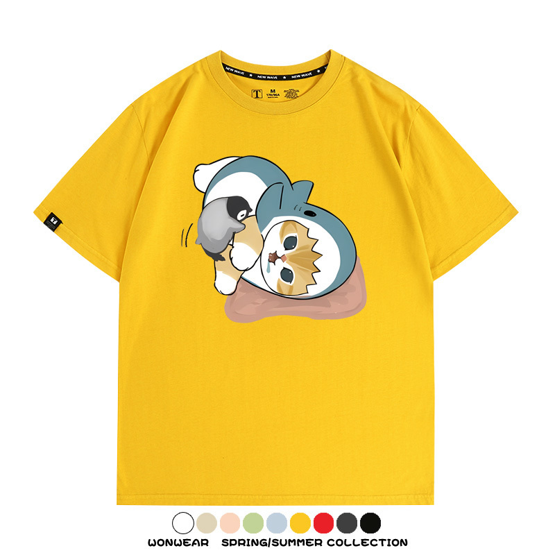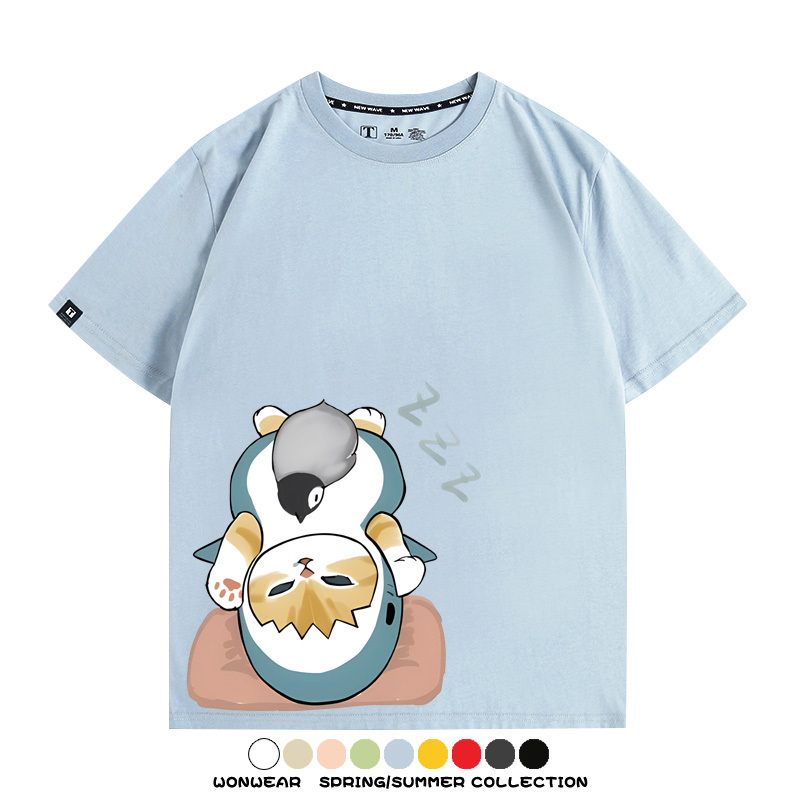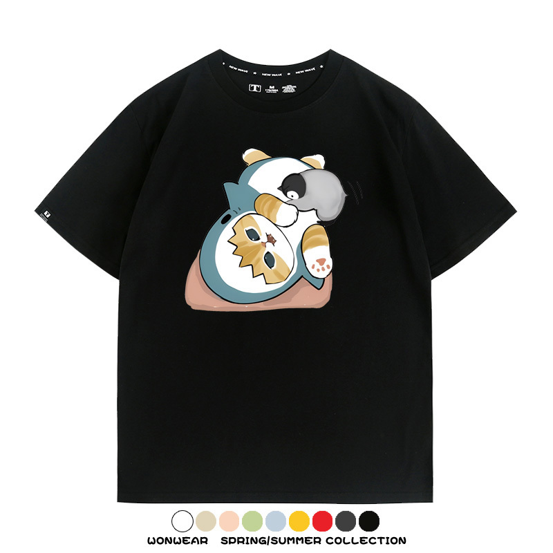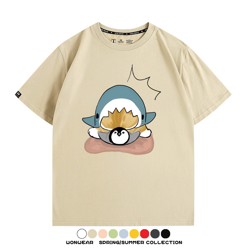 日系貓福珊迪鯊魚COS可愛企鵝鏟屎官情侶短袖純棉夏季寬鬆百搭T恤上衣